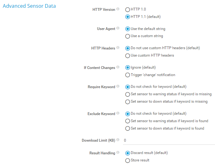 If you enter an absolute URL, the sensor uses this address independently of the IP Address/DNS Name setting of the parent device. You can enter the URL of a web page (to measure the loading time of the page's source code), or enter the URL of an image or of a page asset to measure this element's availability and loading time.