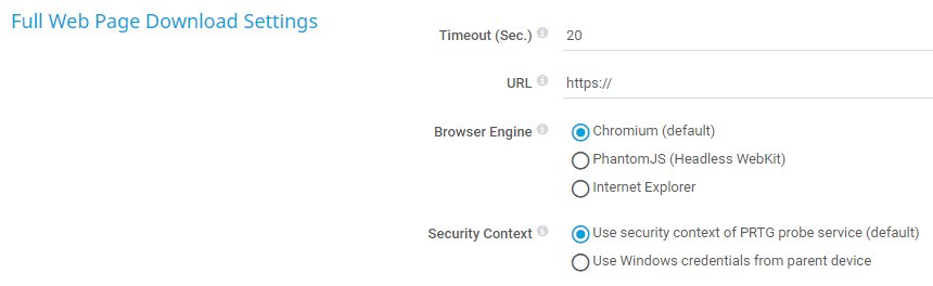 Internet Explorer: With each scanning interval, the URL is loaded in the background in an instance of Internet Explorer. PRTG uses the Internet Explorer of the probe system. For full functionality, we strongly recommend that you install at least Internet Explorer 11 on the probe system. If you select Internet Explorer as browser engine, you might face issues with the creation of temporary files. In this case, we recommend that you use the Chromium or the PhantomJS browser engines. For more information, see the Knowledge Base: Why is my HTTP Full Web Page sensor generating so many temporary files?