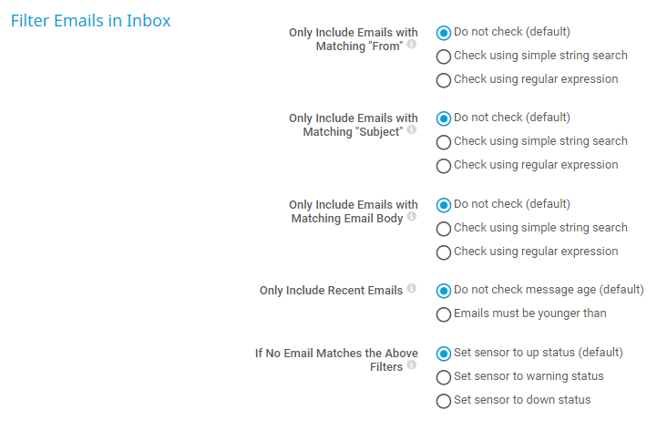 Set sensor to up status (default): Show the Up status if the sensor does not find any email in the mailbox that matches the filters.