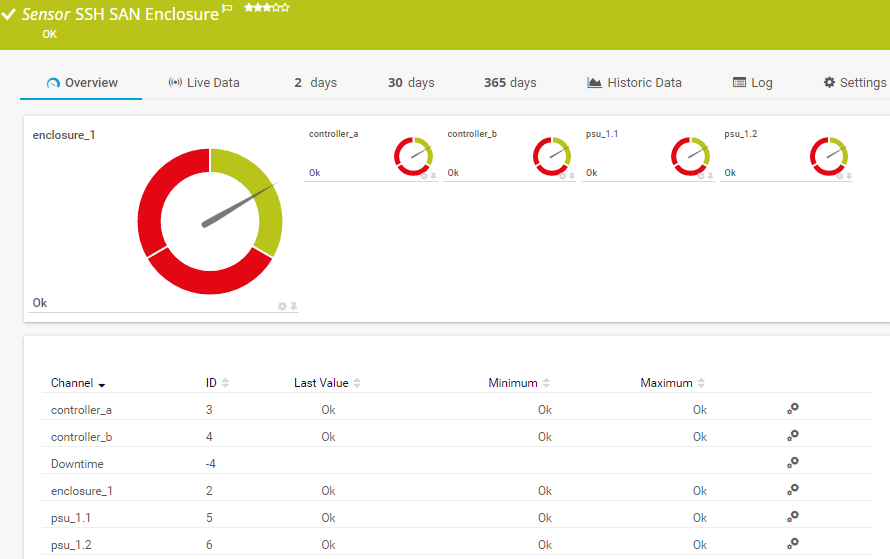 In the channel table on the Overview tab, this channel never shows any values. PRTG uses this channel in graphs and reports to show the amount of time in which the sensor was in the Down status